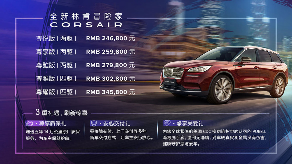 全新林肯冒险家Corsair的上市标志着林肯正式敞开了本土化战略的全新华章,也预示着林肯品牌将以愈加年青化的姿势和脚步满意我国新生代顾客的需求。Corsair的命名来源于拉丁语“Cursus”,意为“旅途”或“道路”,其间文命名“冒险家”涵义带着勇气与才调探究不知道。